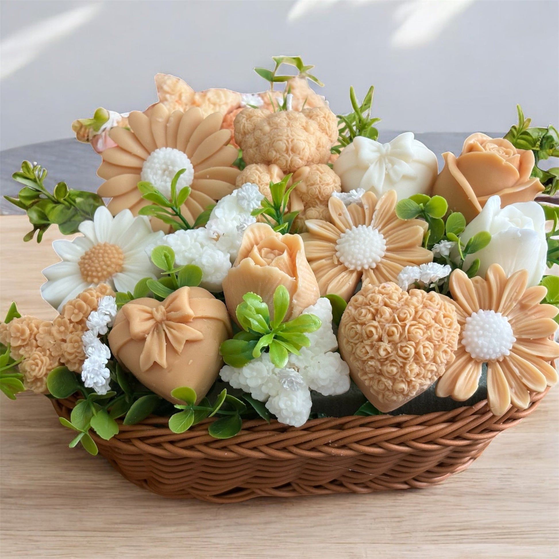 Indulge in the luxurious fragrance of our Bouquet Soy Wax Candles and Wax Melts, elegantly arranged in a gift basket. Made from premium soy wax for a clean, long-lasting burn, these beautifully crafted candles fill your space with enchanting floral scents. Perfect for gifting to loved ones or treating yourself to a spa-like atmosphere at home. Transform any room into a fragrant sanctuary with this ready-to-give collection.  Approximately 12 oz of both candle and wax melts combined
