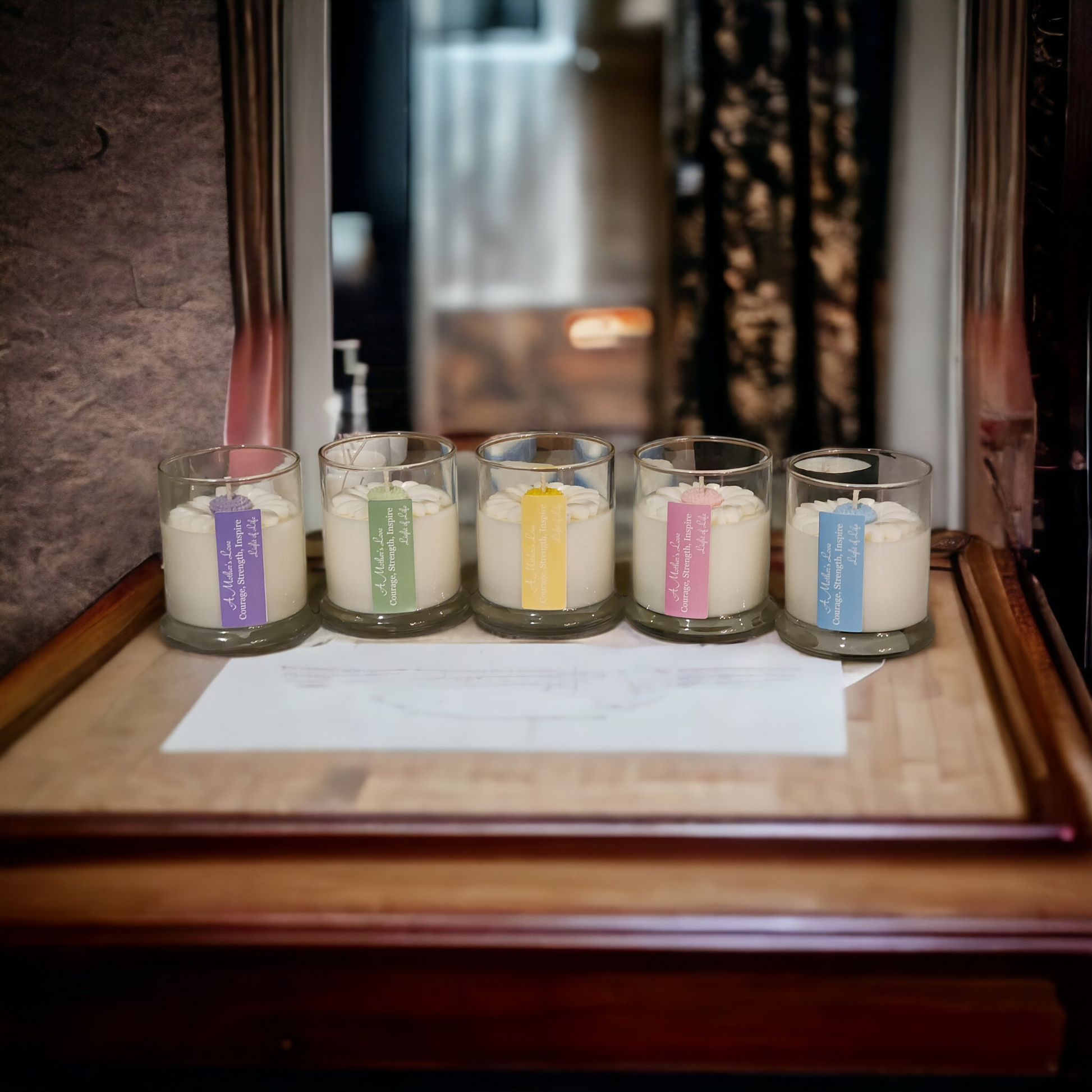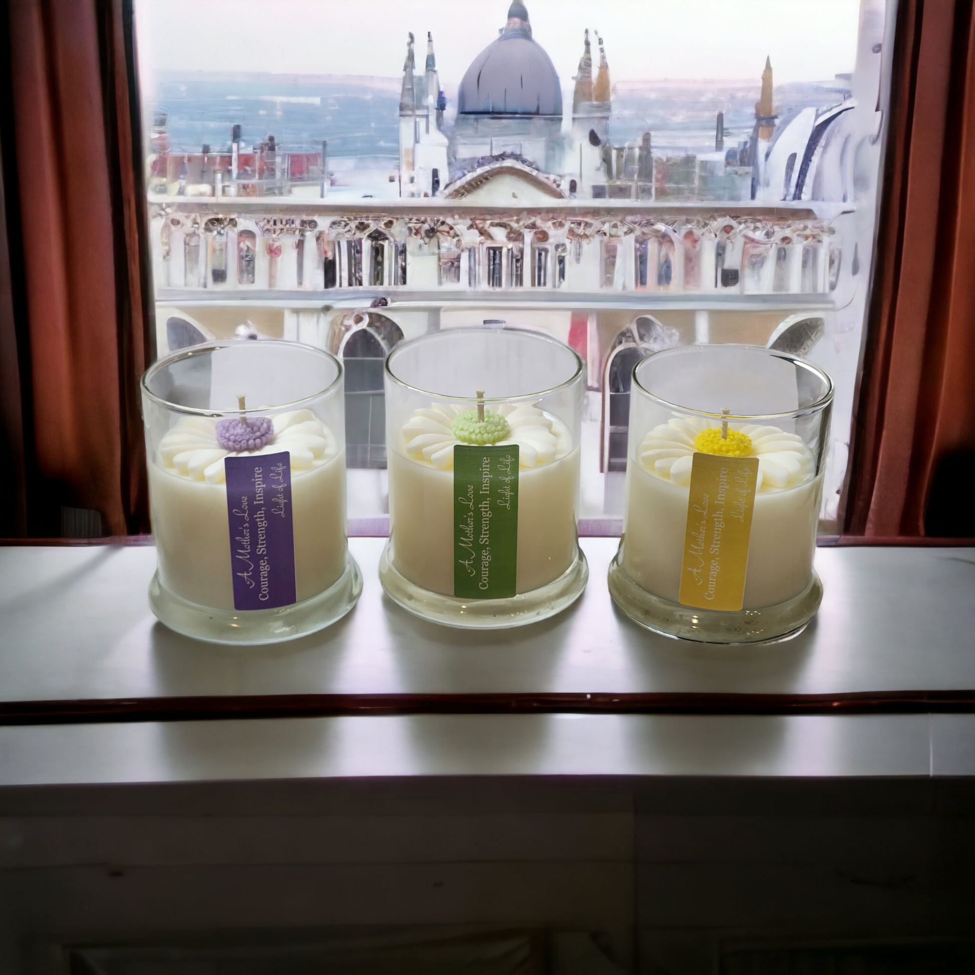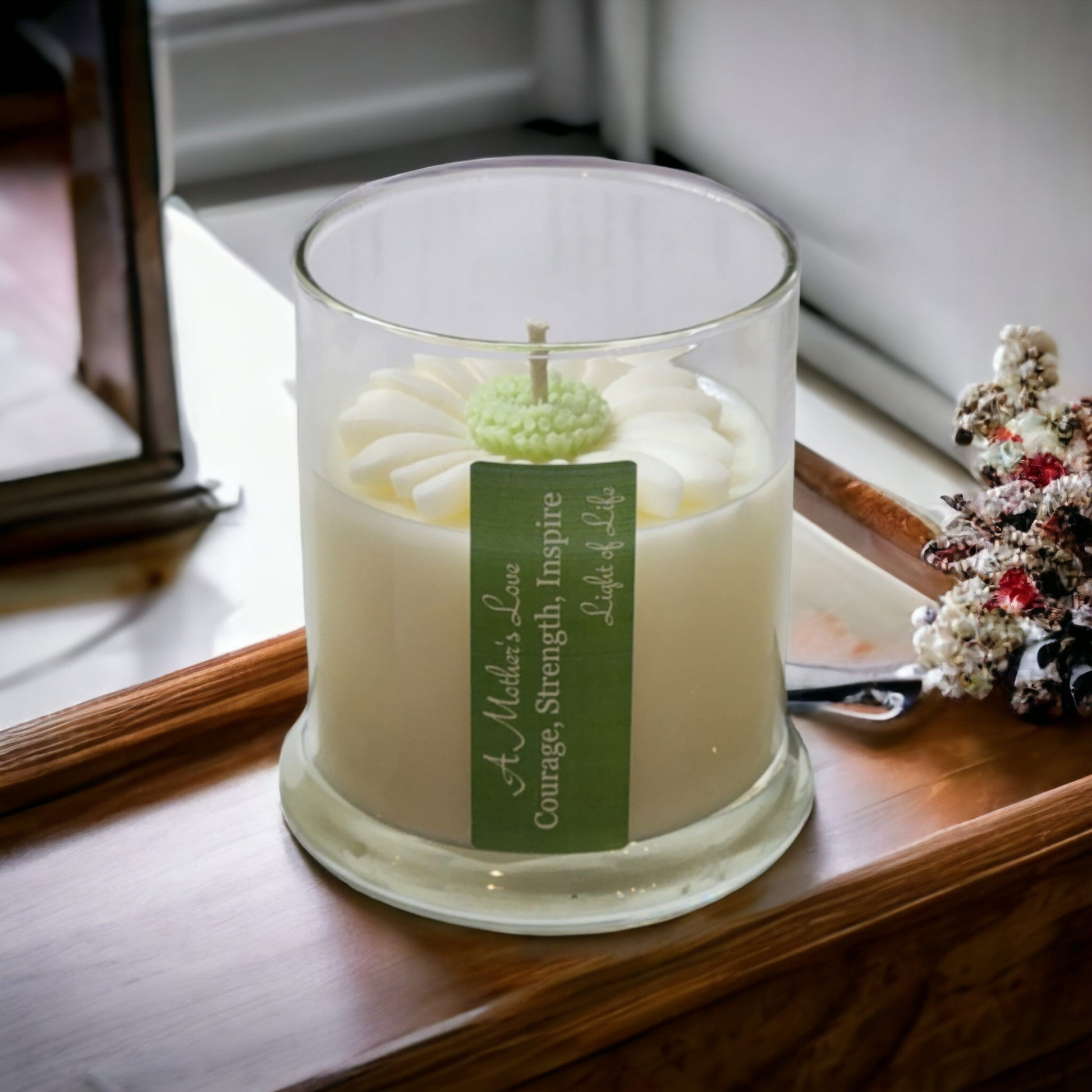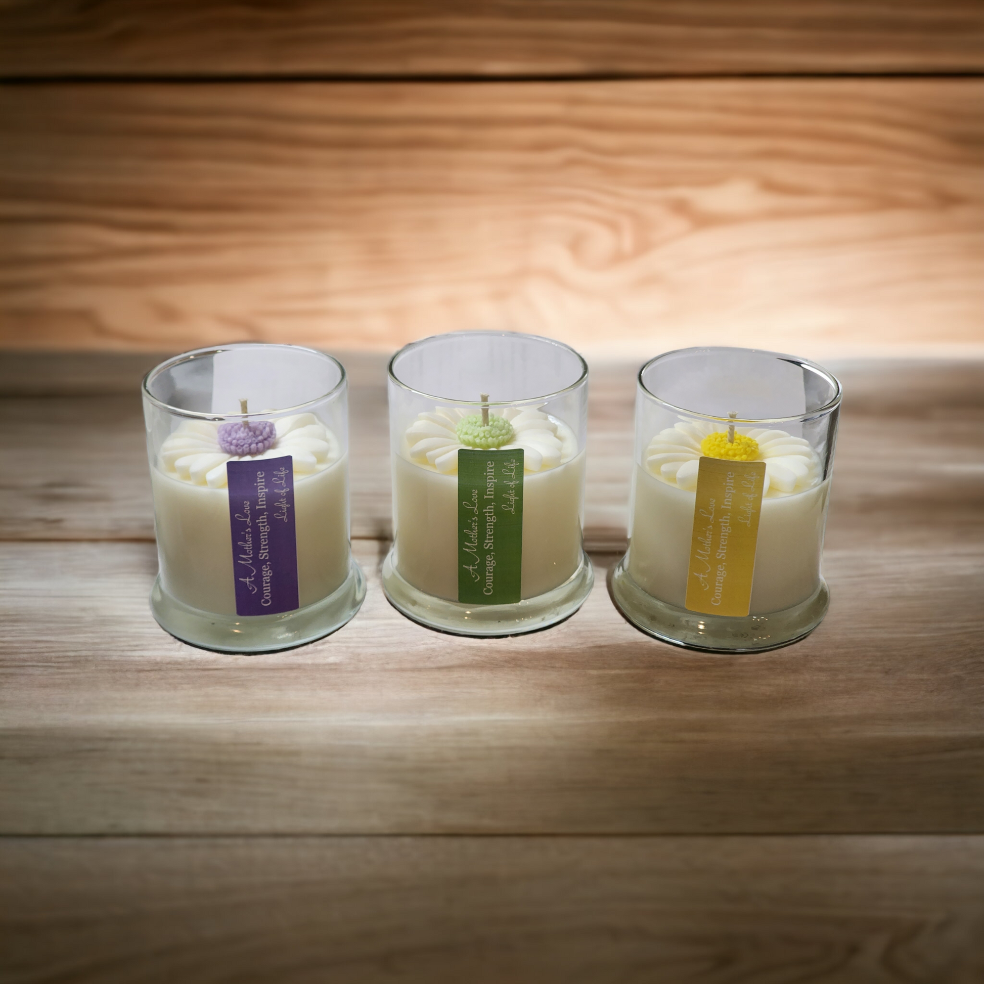 Experience the warmth and delight of our Daisy Themed Soy Candles. Each 12 oz candle features a beautiful daisy design, perfect for Mother's Day. Give the gift of inspiration with a special message, "A mother's love is filled with courage, strength, inspiration. light of life" Our candles are eco-friendly, providing hours of soothing fragrance.
