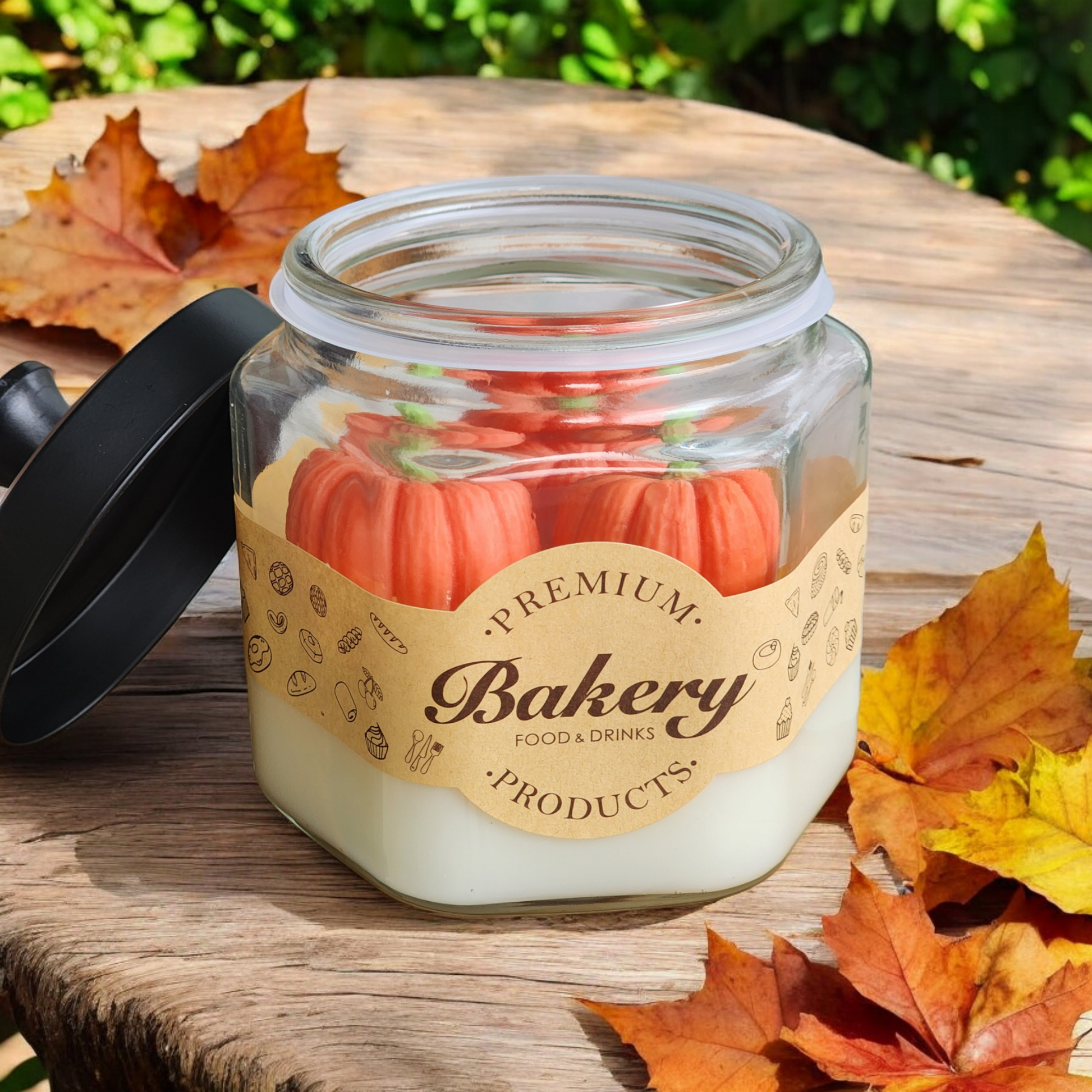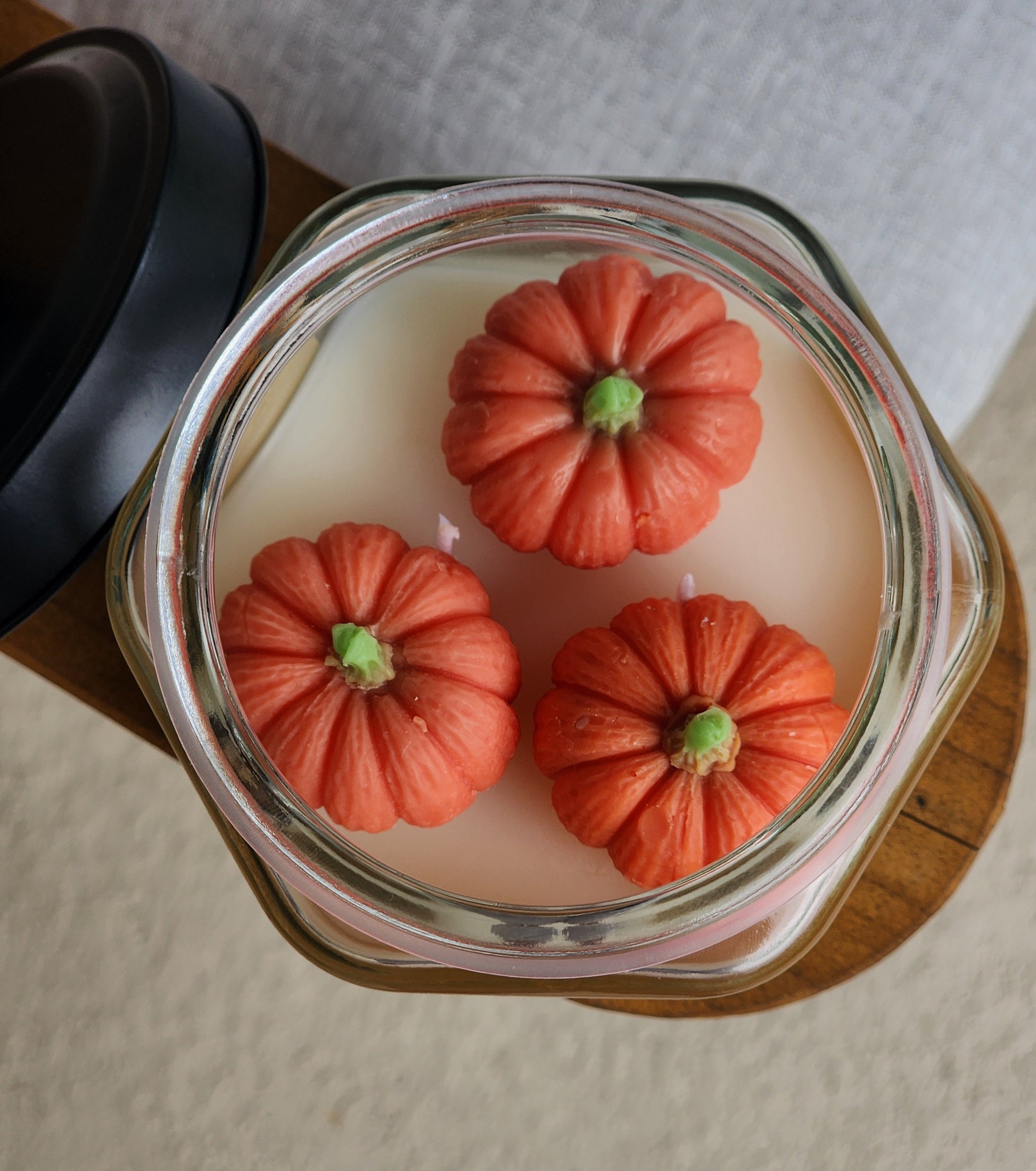 Inside, you'll find three adorable pumpkin-shaped wax embeds nestled on top — making this candle just as beautiful unlit as it is when glowing. Hand-poured with all-natural soy wax and fall-inspired fragrance, it’s perfect for autumn gifting, decor, or your own cozy corner.