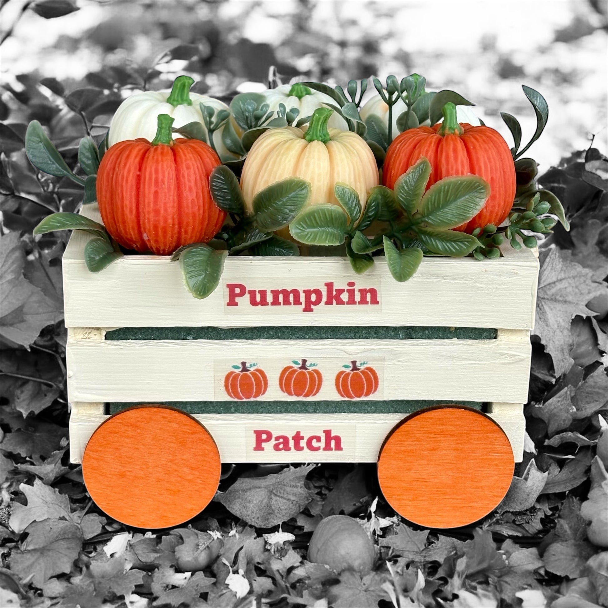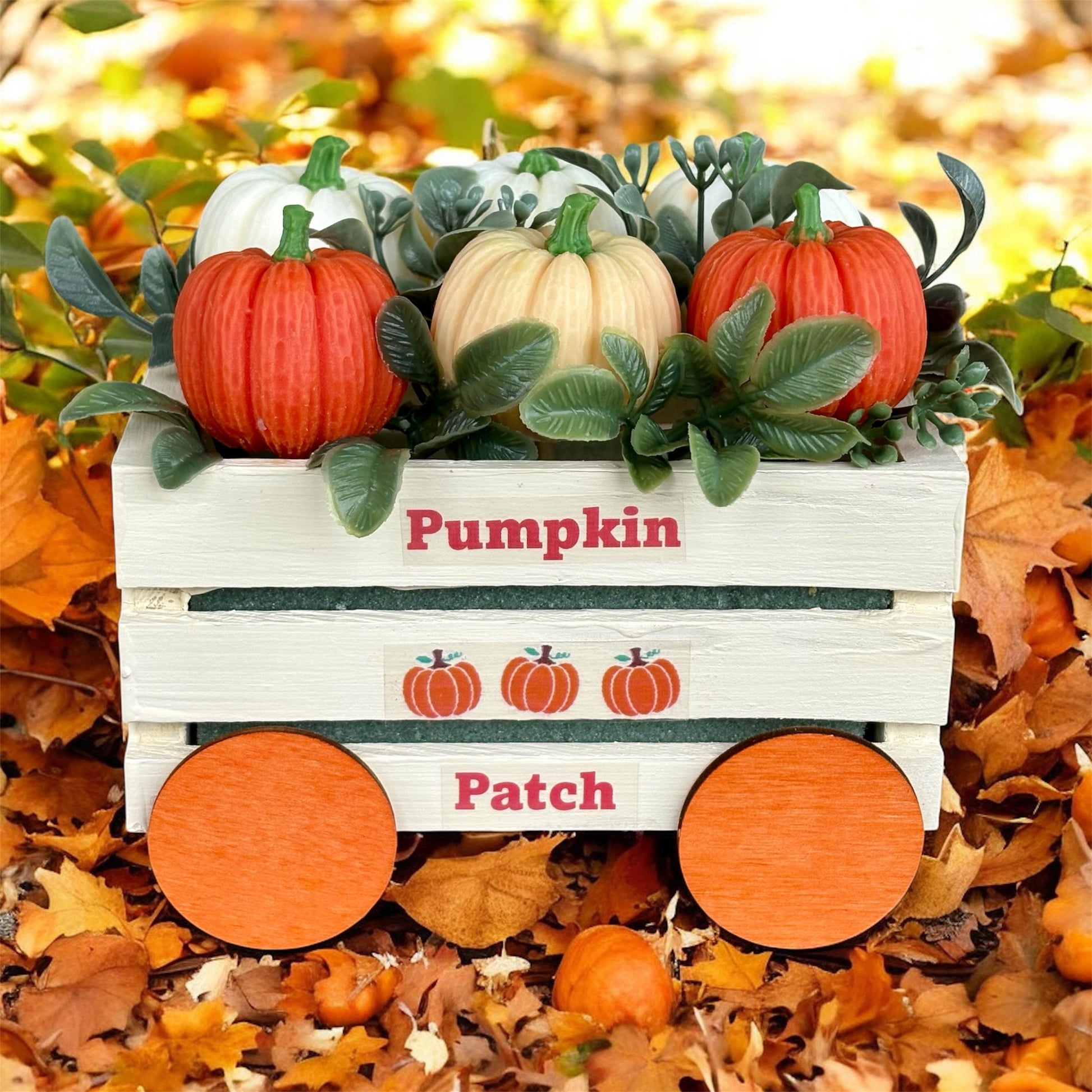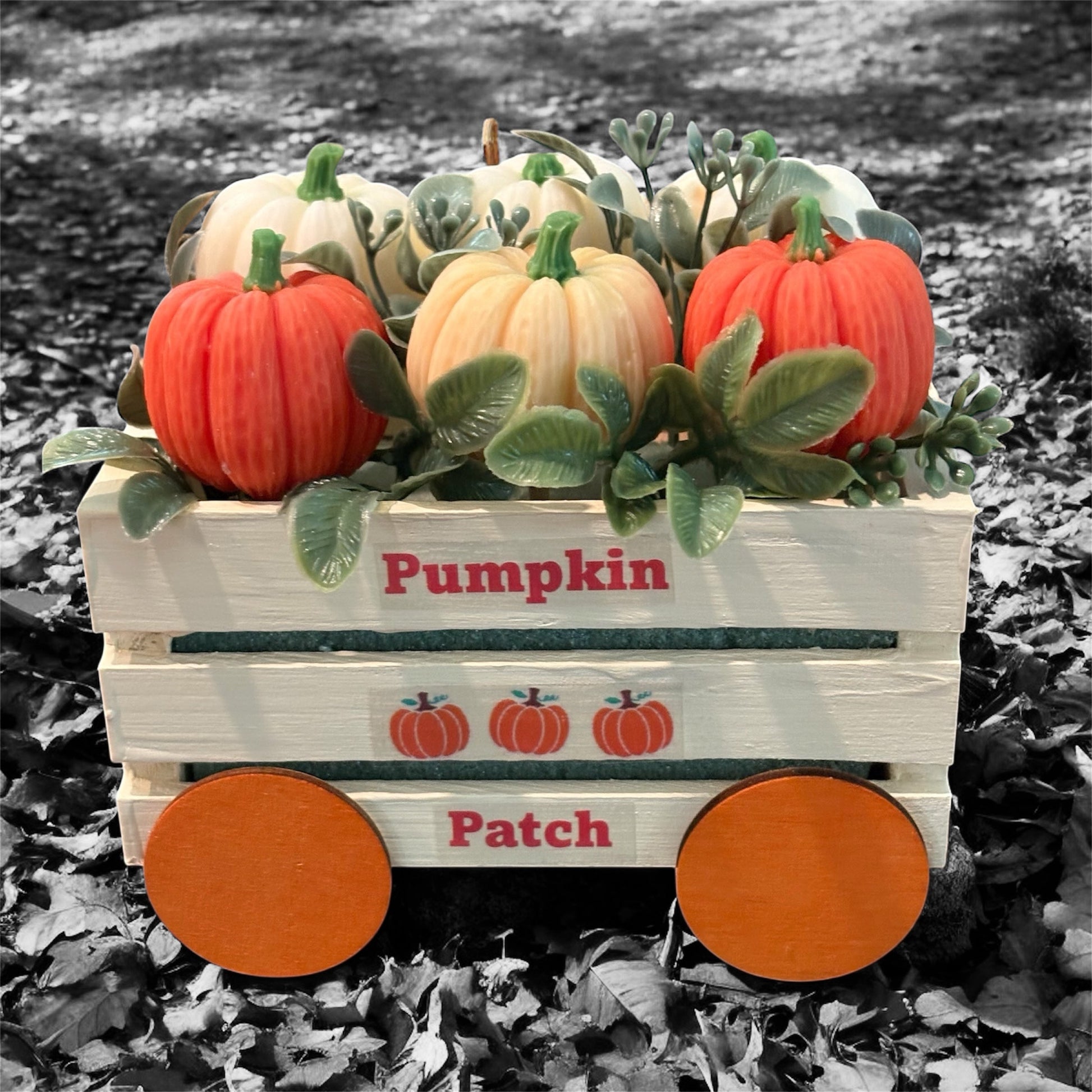 Bring the cozy charm of autumn into your home with our Pumpkin Patch Wax Melt Set! This delightful collection includes six 1oz pumpkin-shaped scented wax melts, beautifully nestled in a miniature wooden wagon for a rustic, seasonal touch.