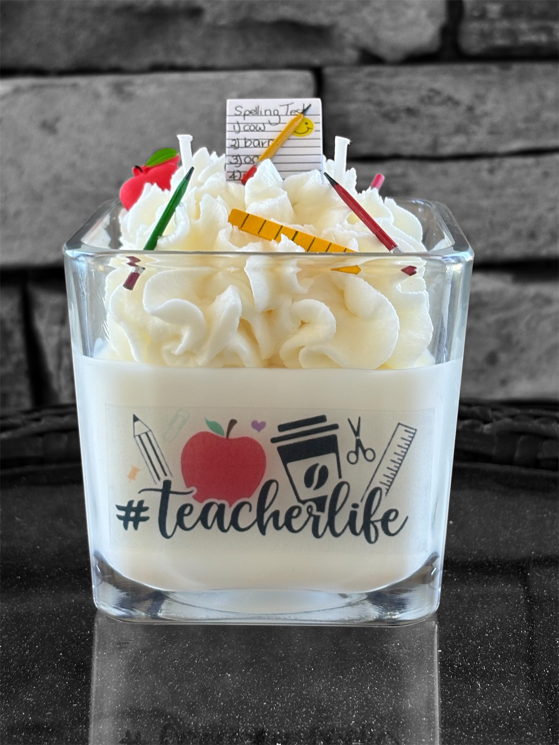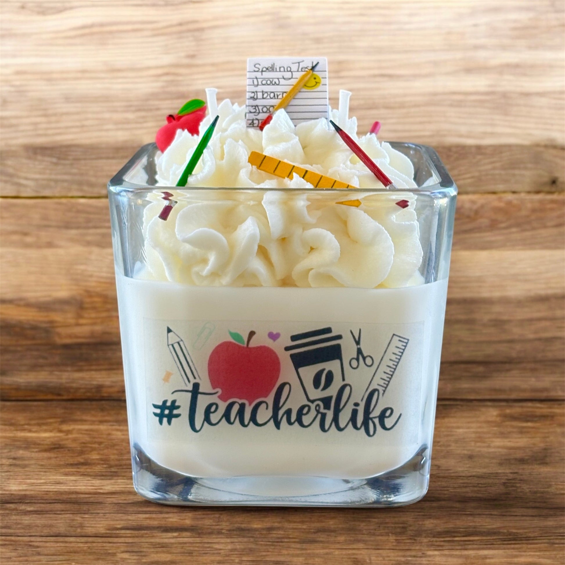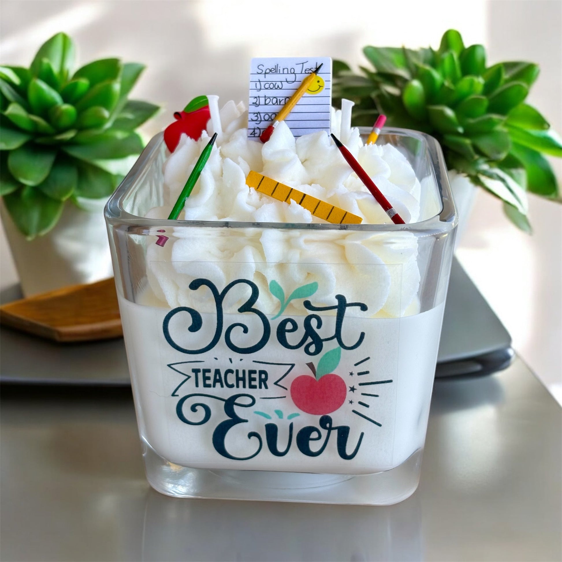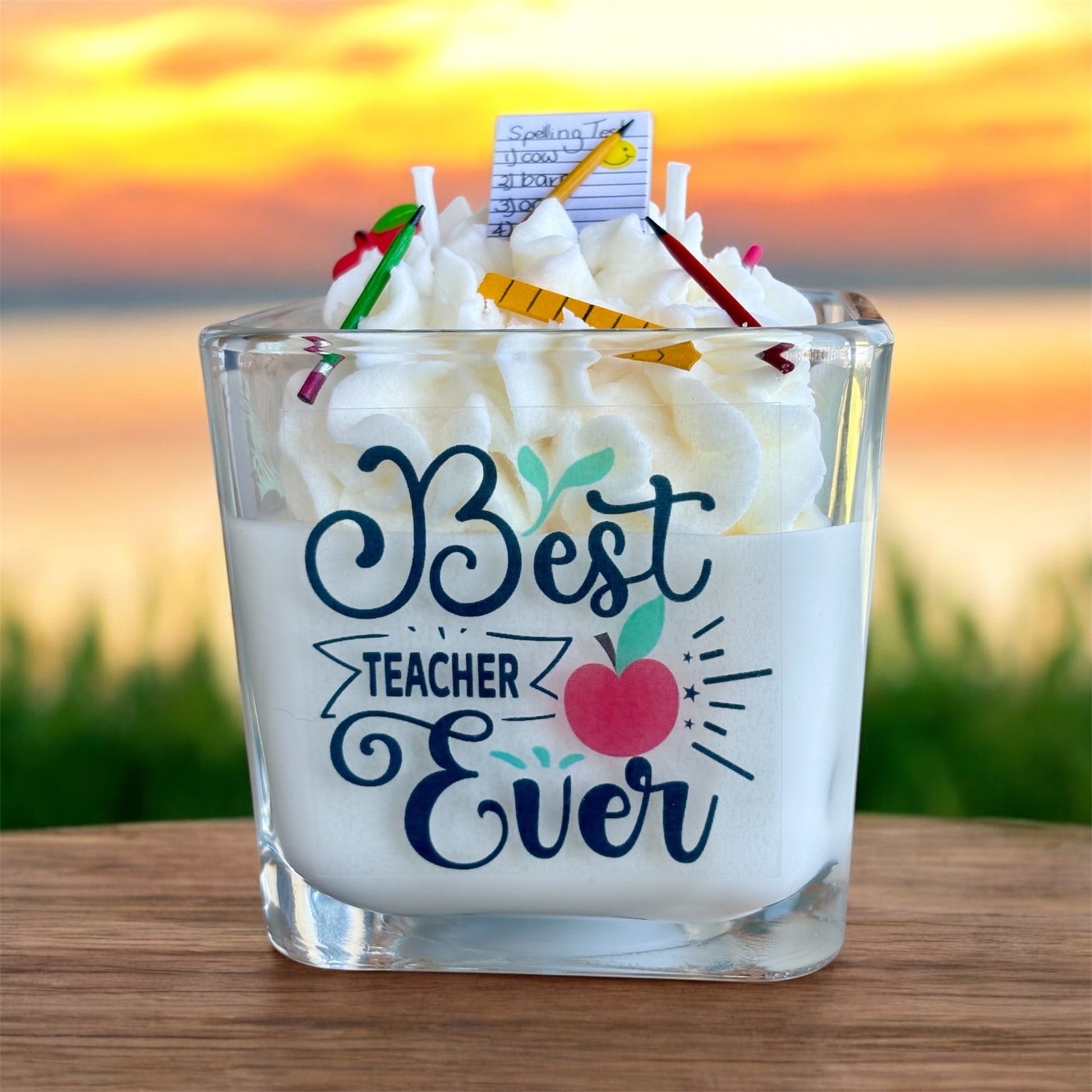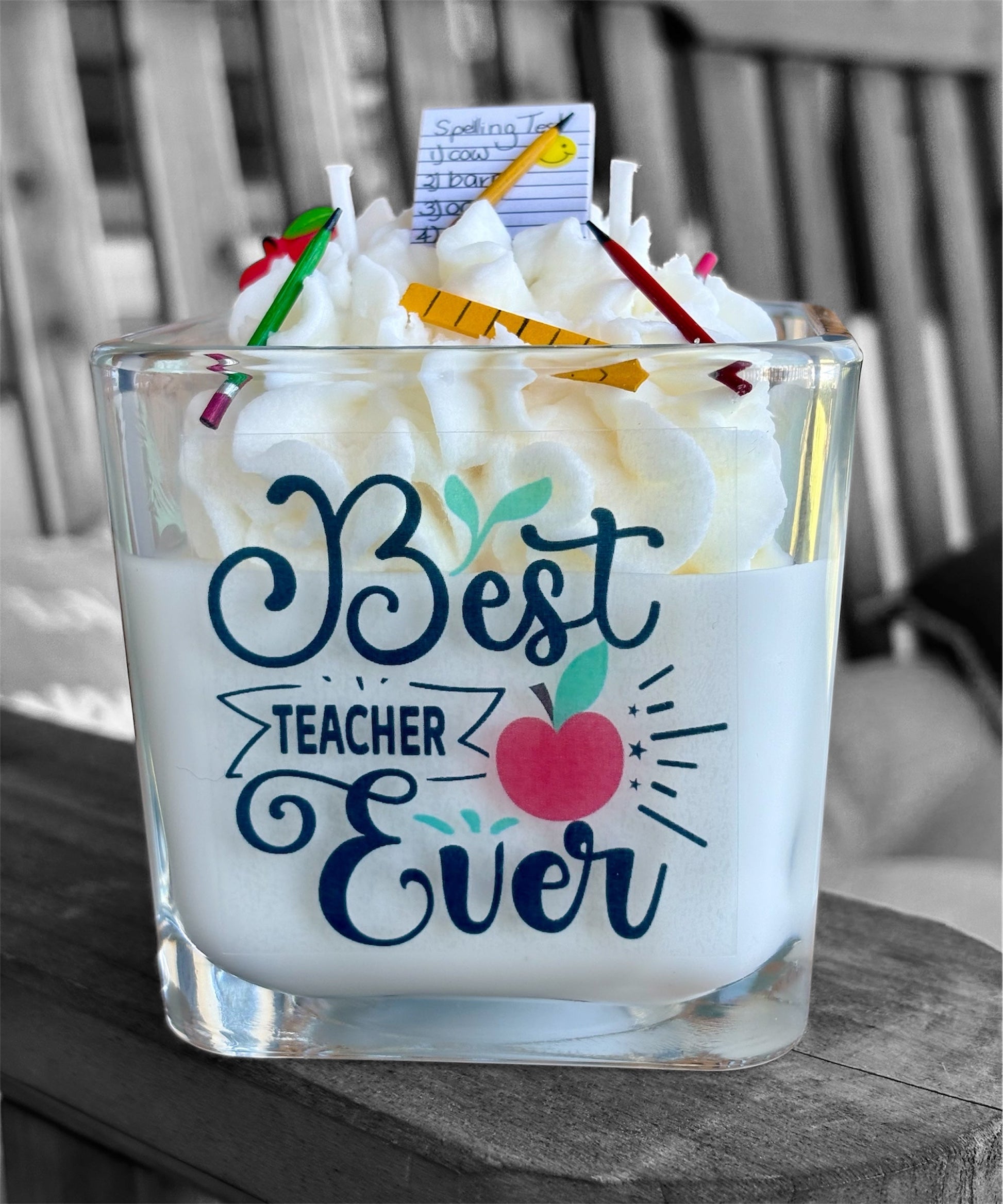 Surprise your favorite teacher with our Teacher Candles, showcasing unique school supplies embedded in the wax. Express your appreciation with every burn. 16oz